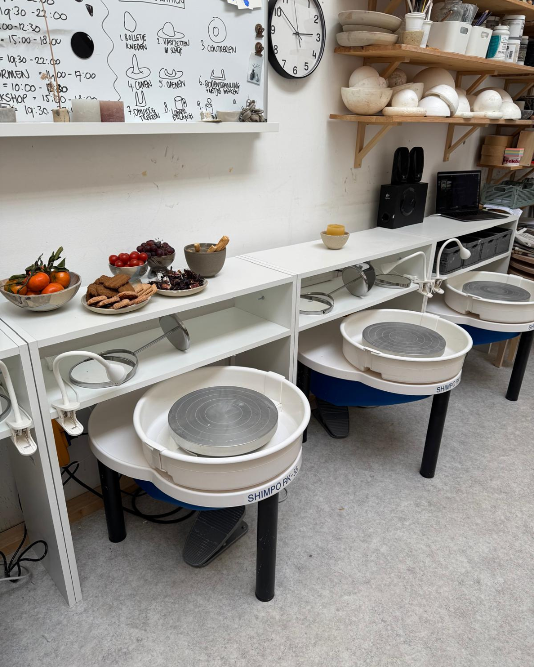 In de studio is tijdens een handvorm workshop plek voor 8 mensen. Tijdens een draaiworkshop is er plek voor 4 deelnemers, alle draaischijven zijn dan bezet.