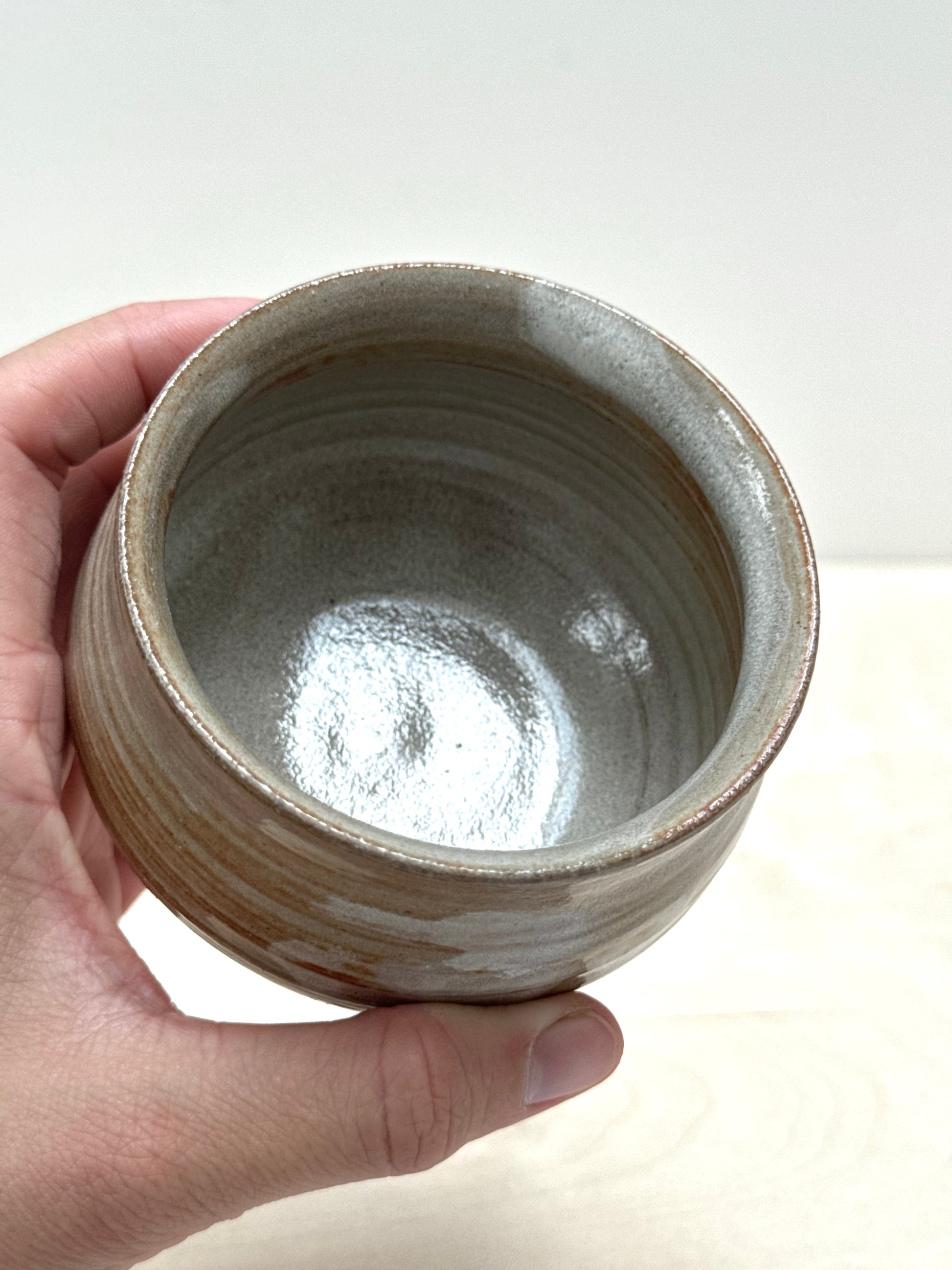 A lovely cup for coffee or tea. Wheelthrown off the hump in a black stoneware clay. Finished with a gloss white glaze which reacts with the black clay to create rust brown coloured areas.
