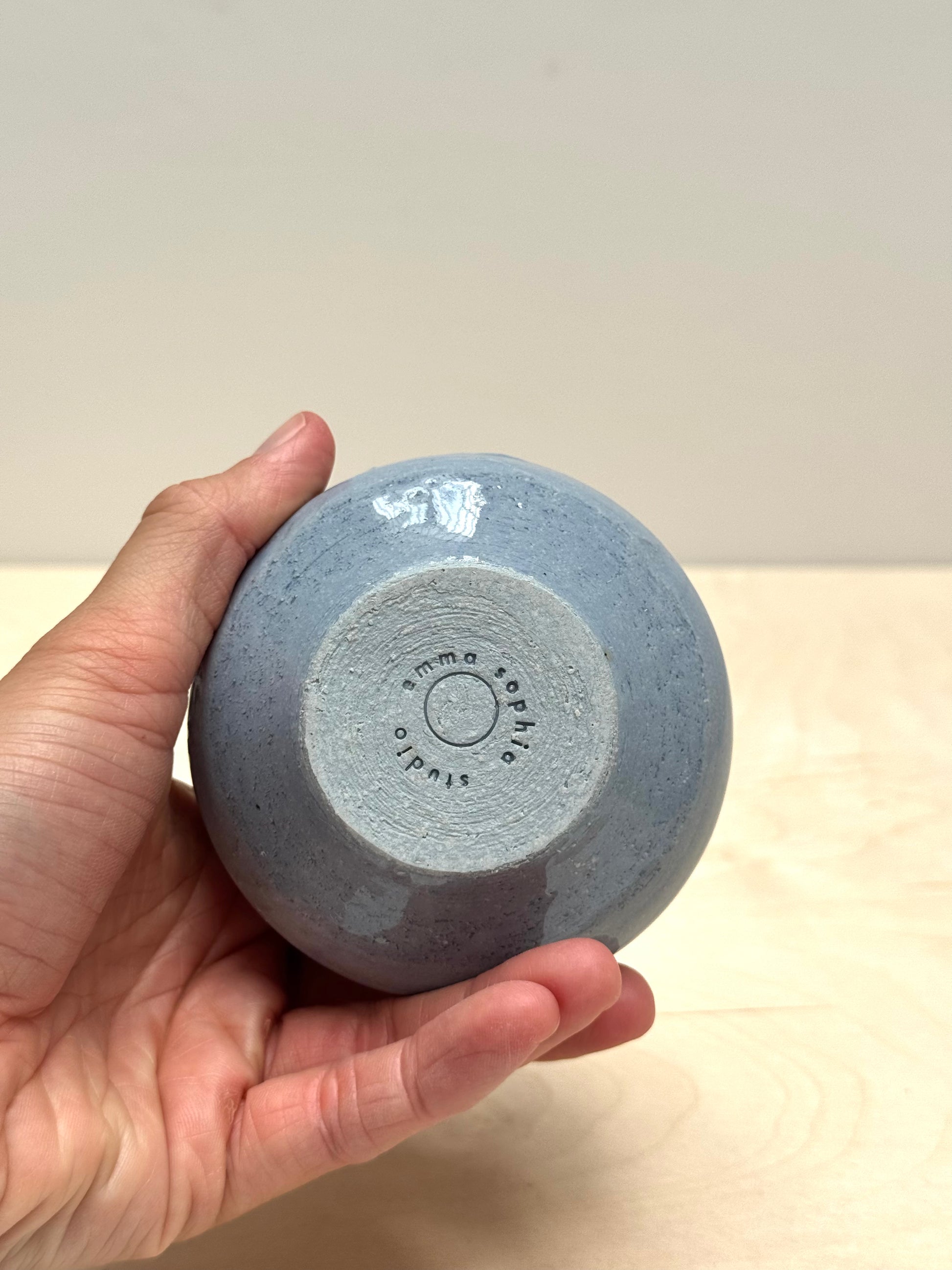 A lovely cup for coffee or tea. Wheelthrown off the hump in a blue coloured stoneware clay. Finished with a gloss clear glaze.