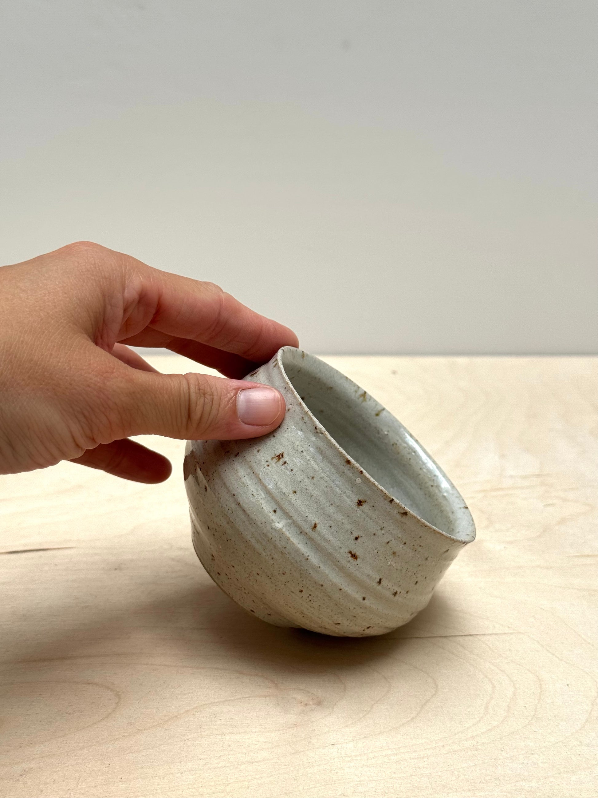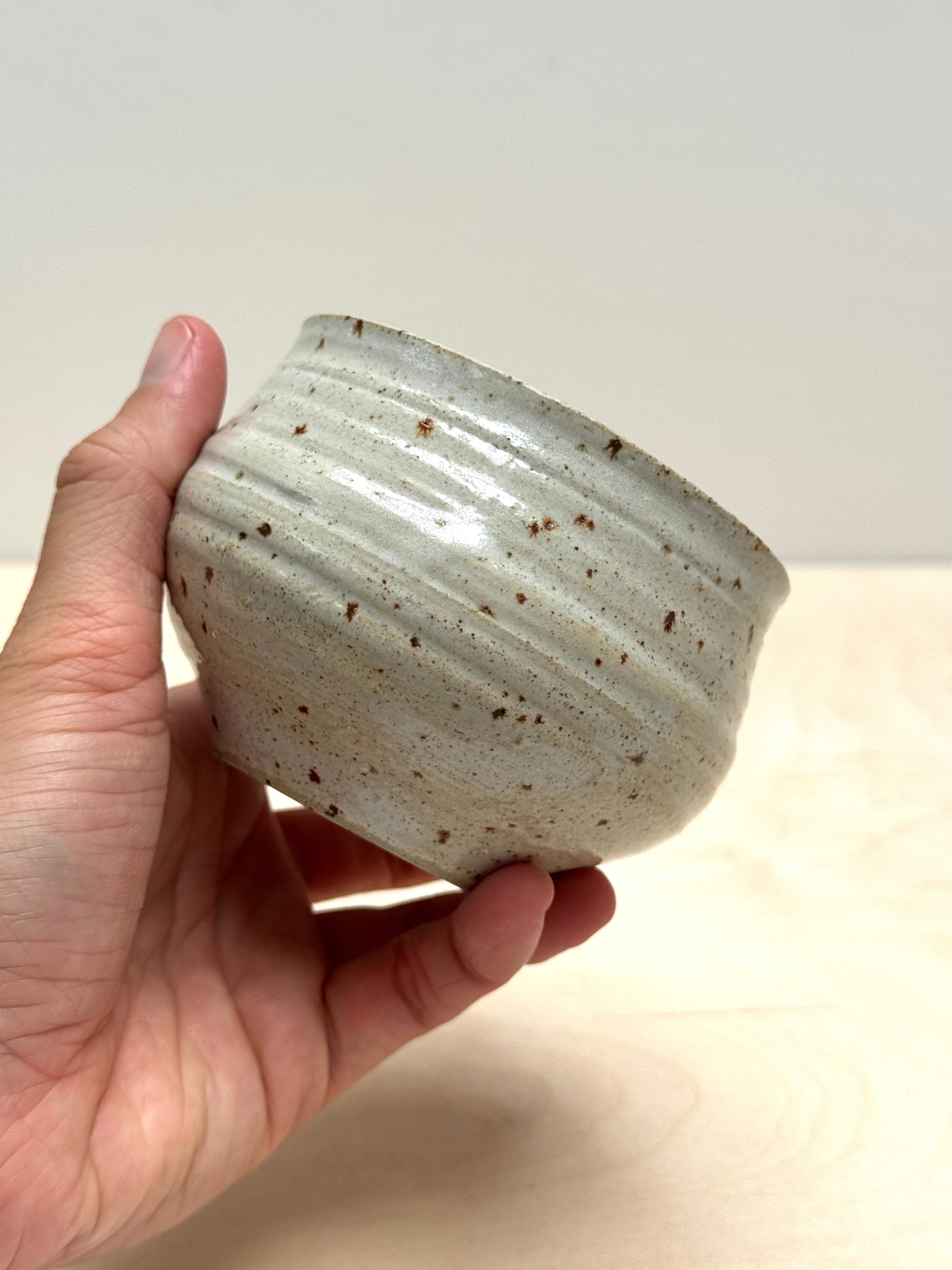 A lovely cup for coffee or tea. Wheelthrown off the hump in a grey speckled stoneware clay. Finished with a gloss white glaze which enhances the brown speckles.