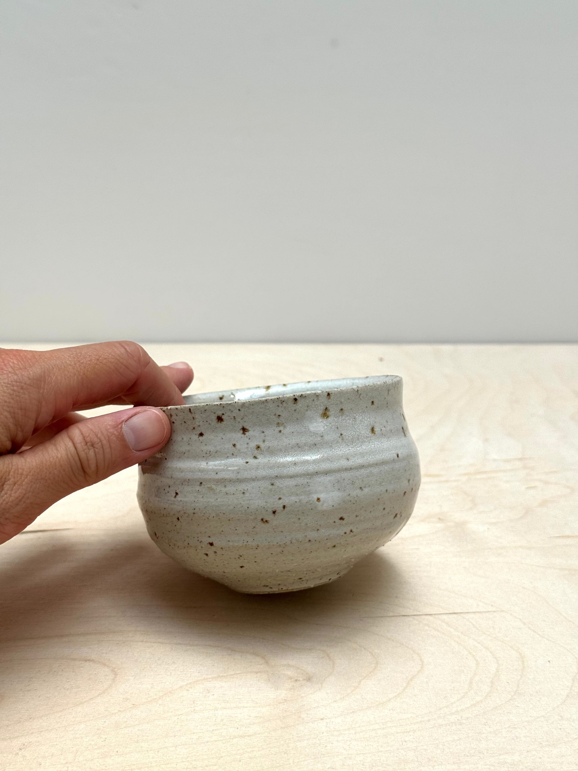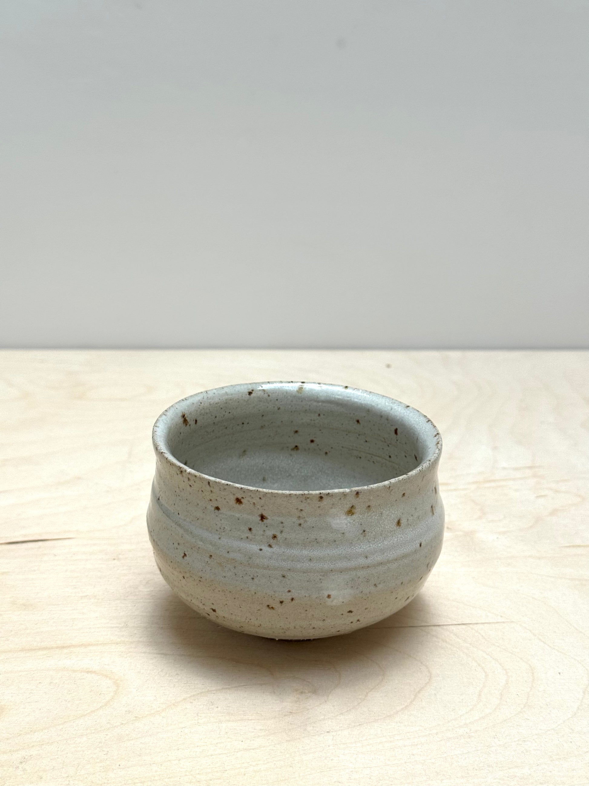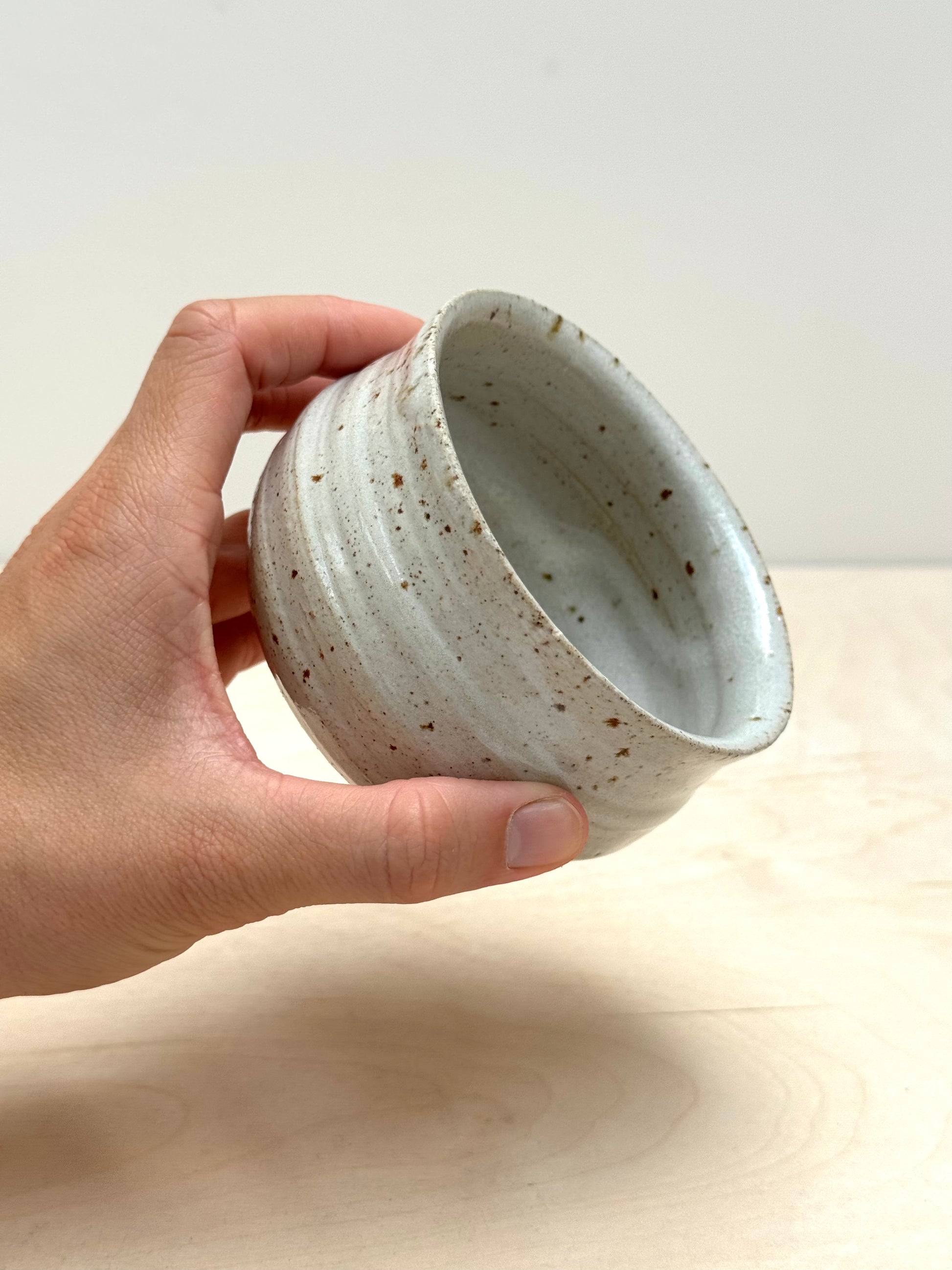 A lovely cup for coffee or tea. Wheelthrown off the hump in a grey speckled stoneware clay. Finished with a gloss white glaze which enhances the brown speckles.