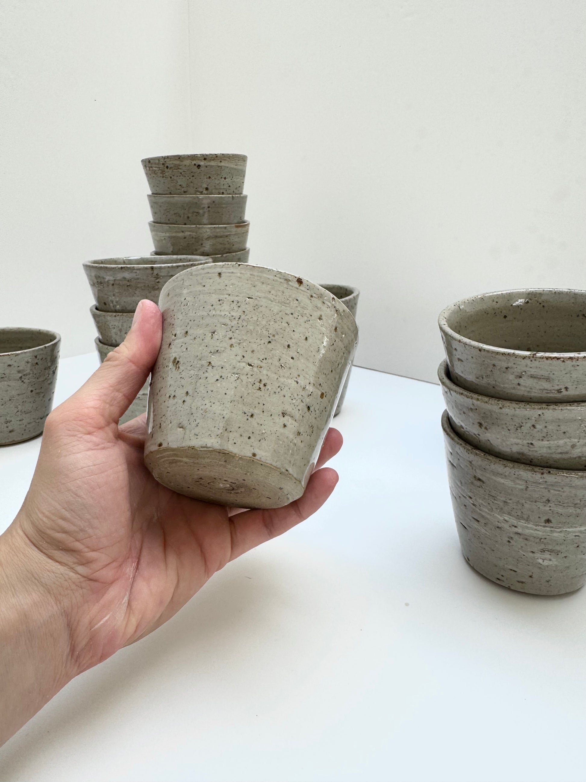 Wheelthrown using reclaimed grey, speckled clay with a subtle marble effect. Finished with my new reclaimed glaze batch, mostly glossy transparent but with a subtle milky effect.