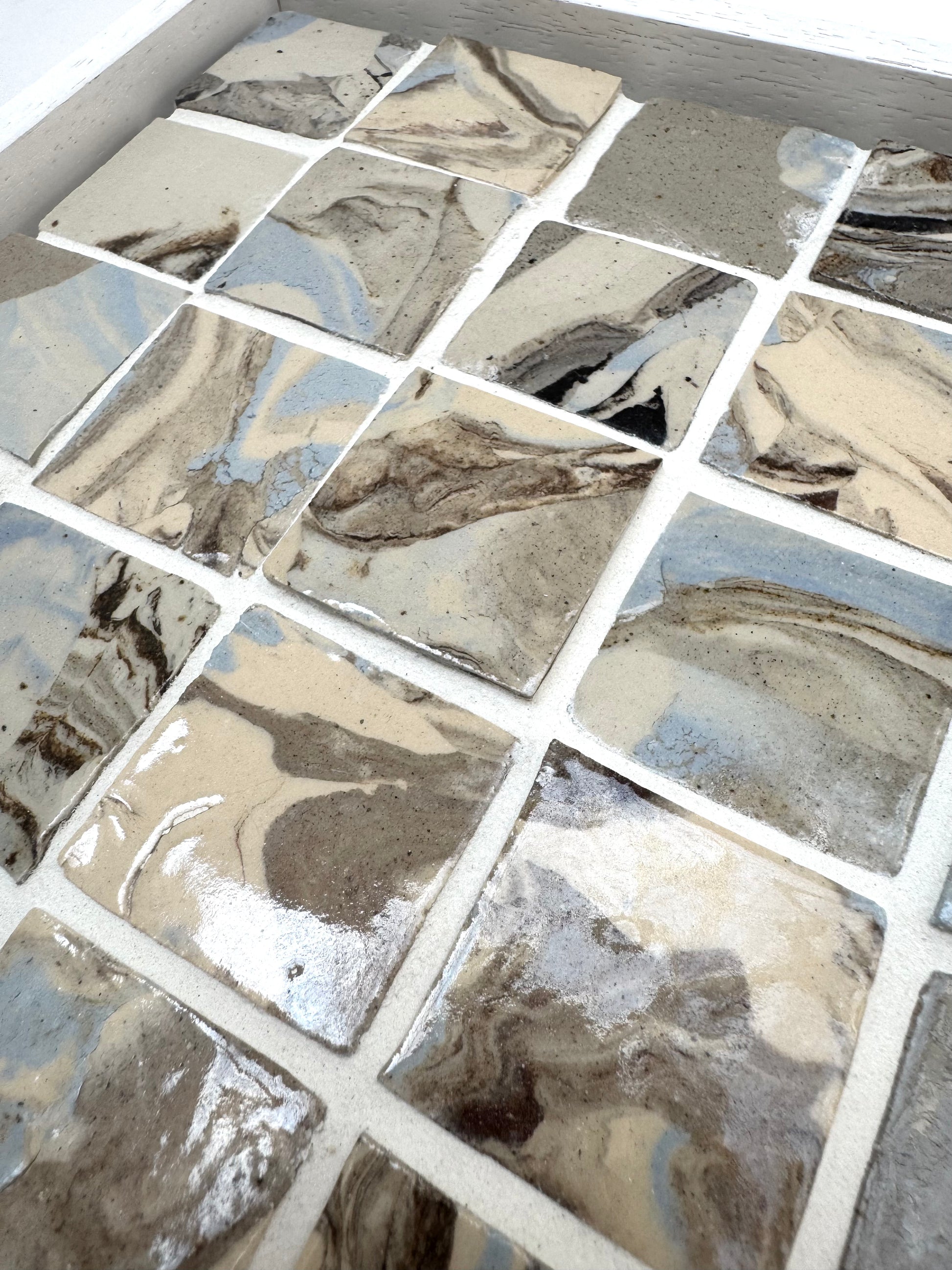 Framed artwork consisting of 25 individual small ceramic tiles, all made by hand.