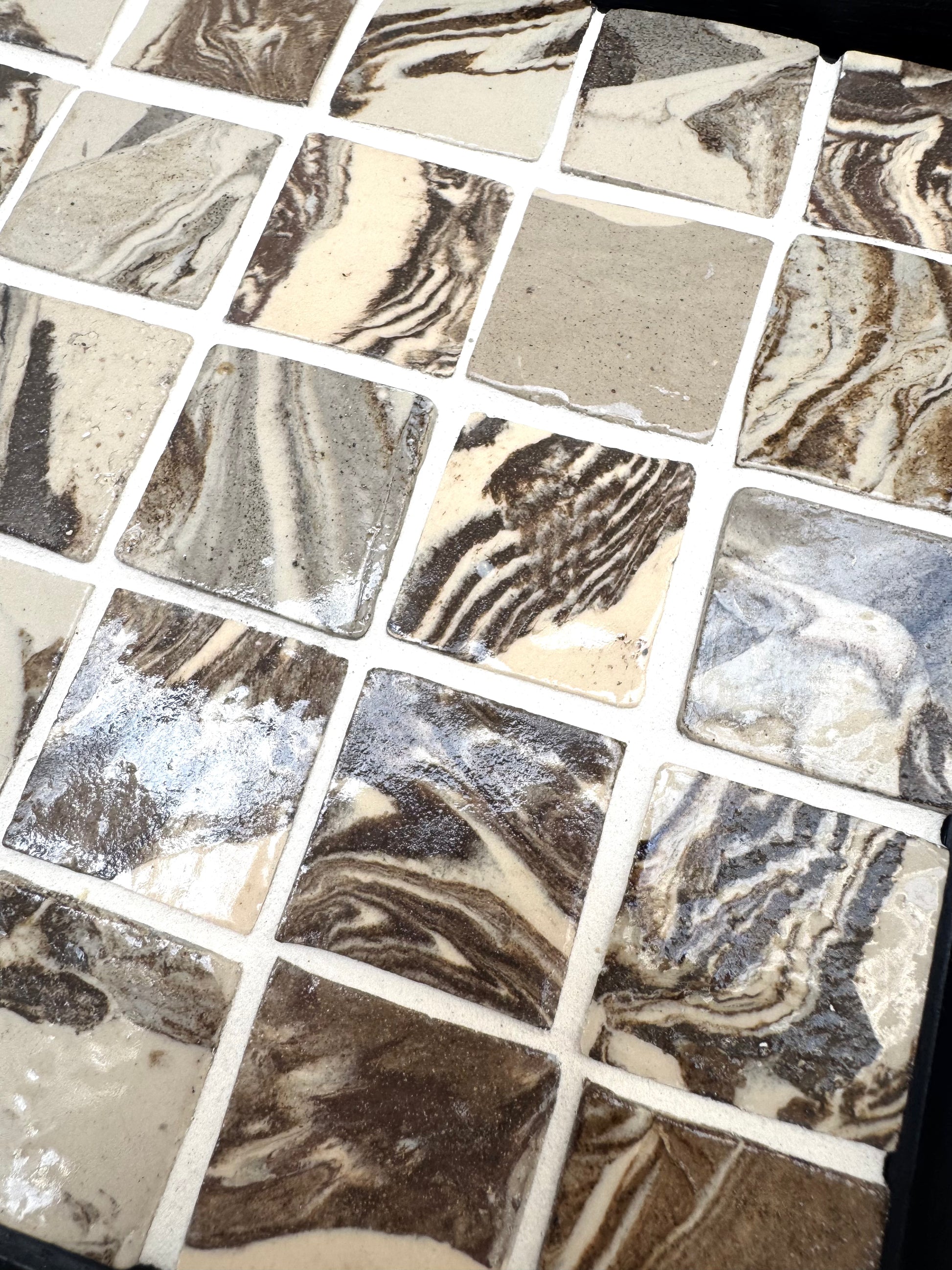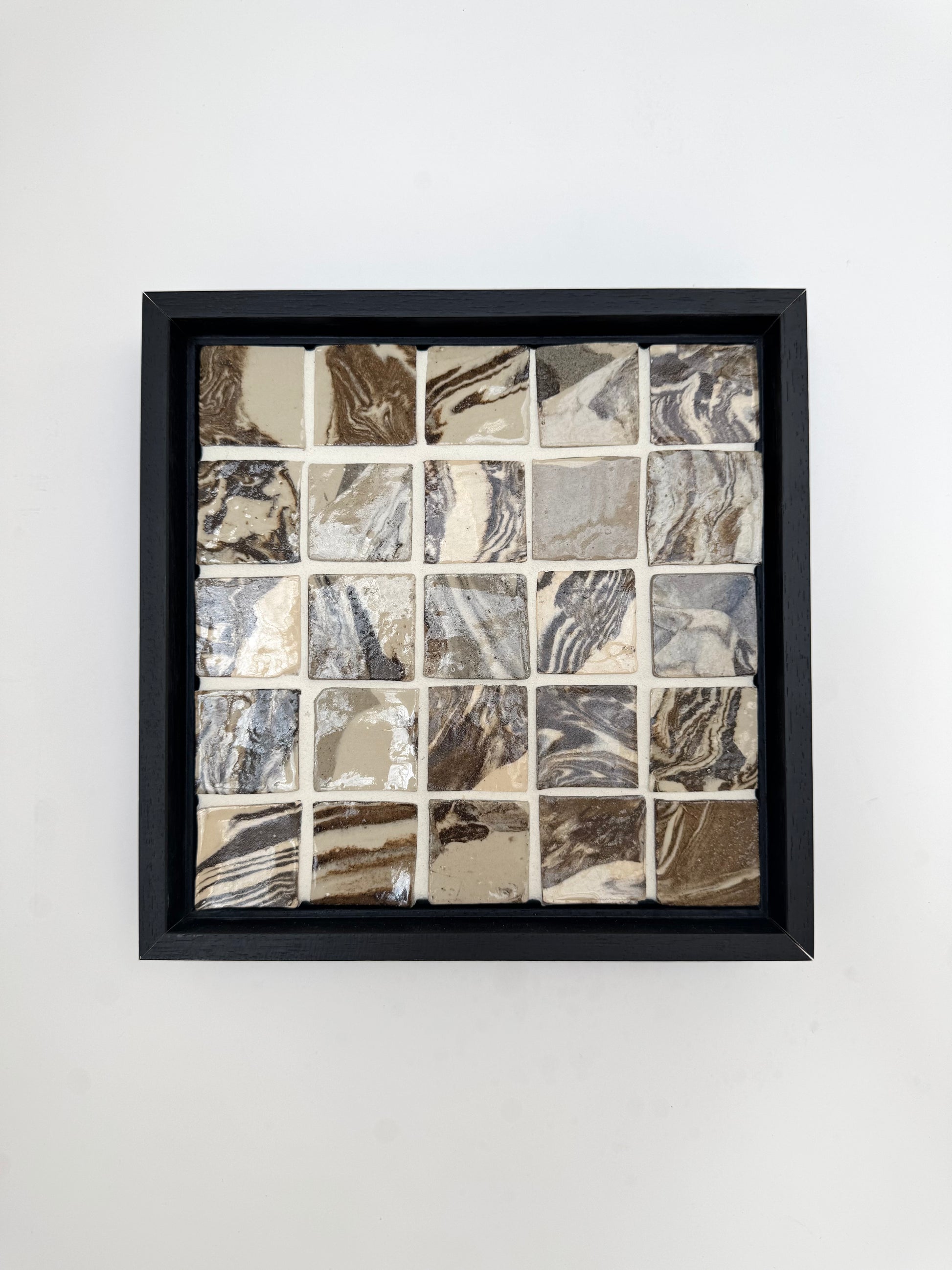 Framed artwork consisting of 25 individual small ceramic tiles, all made by hand.