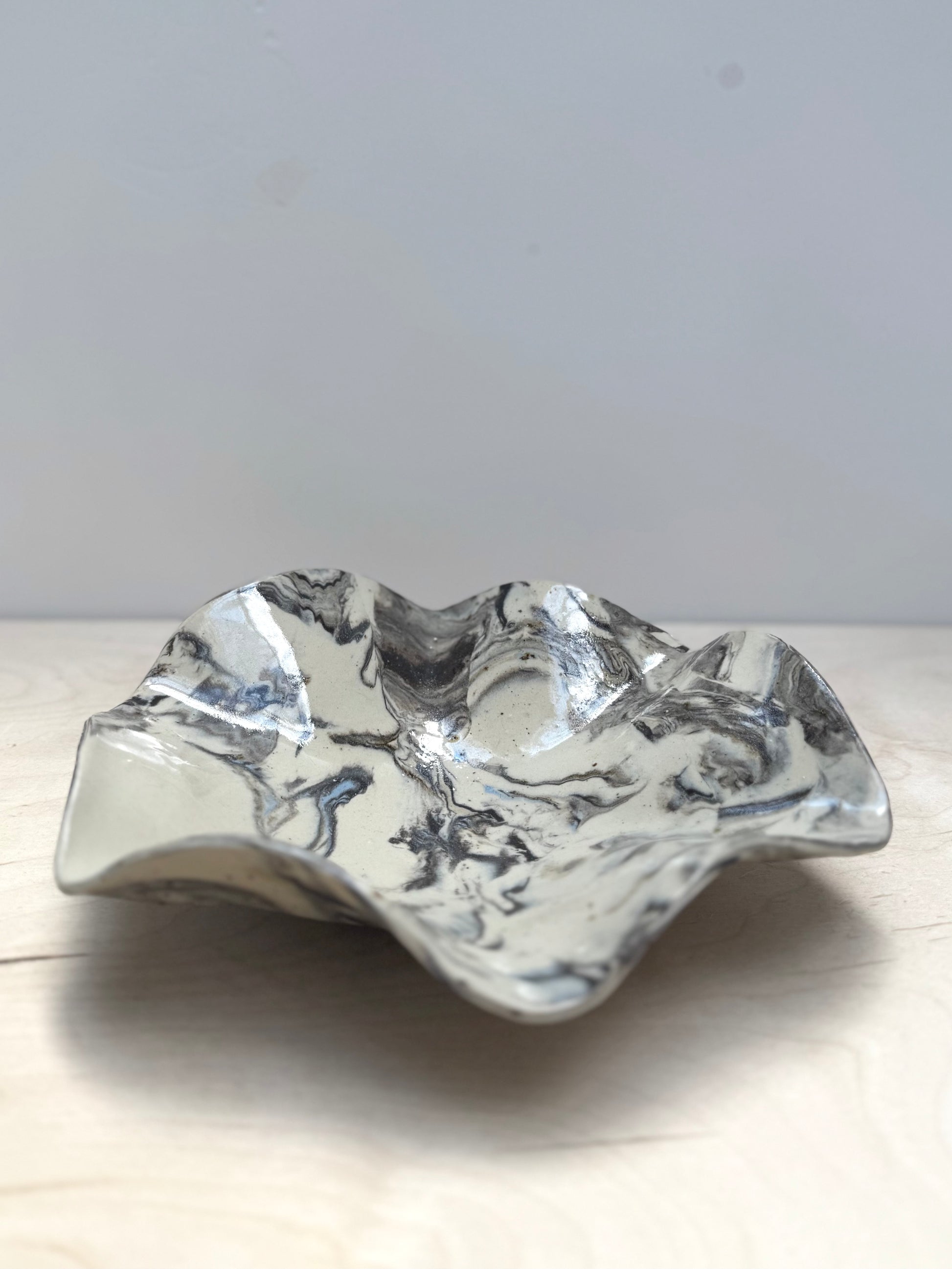 One of a kind bowl for fruit or snacks. Made using the nerikomi technique of layering different colours of clay. Finished in a glossy clear glaze.